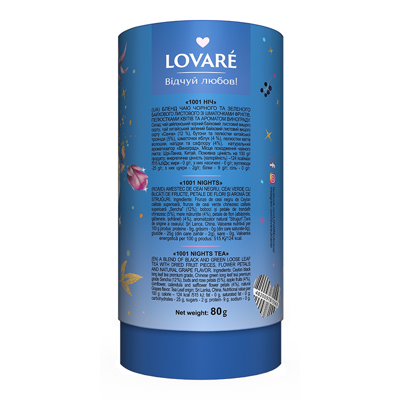 Produsul prezentat este Lovare "1001 Nights", un amestec sofisticat de ceai negru și ceai verde, într-o prezentare atractivă ce aduce magia nopților arabe în fiecare ceașcă. Această combinație este îmbogățită cu petale de trandafir și arome naturale de fructe, conferind o experiență gustativă unică și rafinată. Ambalajul vibrant, decorat cu flori și elemente astrale, nu doar că protejează calitatea premium a ceaiului, dar îl și transformă într-un cadou ideal pentru orice ocazie. Fiecare cutie conține 80g de ceai, asigurând multe momente de relaxare și plăcere.