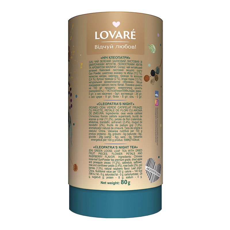 Lovare "Cleopatra's Night", un ceai verde captivant cu o compoziție regală ce îmbină frunze de ceai cu bucatele de fructe uscate și petale de flori, inspirând din opulența și misterul nopților egiptene. Acest amestec aromatic include note florale și fructate, care echilibrează subtil aroma intensă a ceaiului verde. Ambalajul elegant, împodobit cu ilustrații ce evocă farmecul și seducția Cleopatrei, face din acest ceai nu doar o băutură plăcută pentru simțuri, ci și un cadou deosebit. Fiecare cutie conține 80g de ceai, perfect pentru a transforma orice seară obișnuită într-o experiență extraordinară.