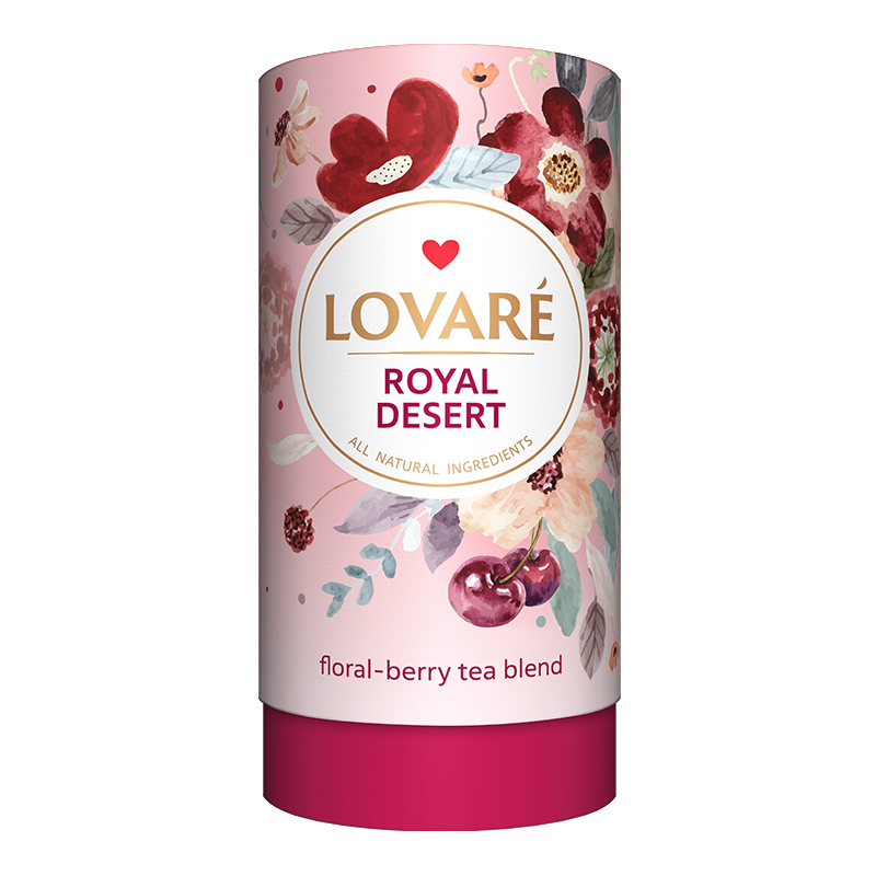 Lovare "Royal Desert", un ceai floral-berry ce încapsulează esența unui desert regal printr-un amestec sofisticat de fructe de pădure și petale de flori. Acest ceai îmbină note dulci și aromatice, cu bucăți de căpșuni și zmeură, completate de delicatețea petalelor de trandafir și de aromele naturale de vanilie, pentru o experiență de degustare plină de indulgență. Ambalajul său atrăgător, decorat cu elemente florale și fructe, reflectă luxul și calitatea premium a ingredientelor. Fiecare cutie conține 80g de ceai, ideal pentru momente speciale sau pentru a aduce un strop de răsfăț în rutina zilnică.